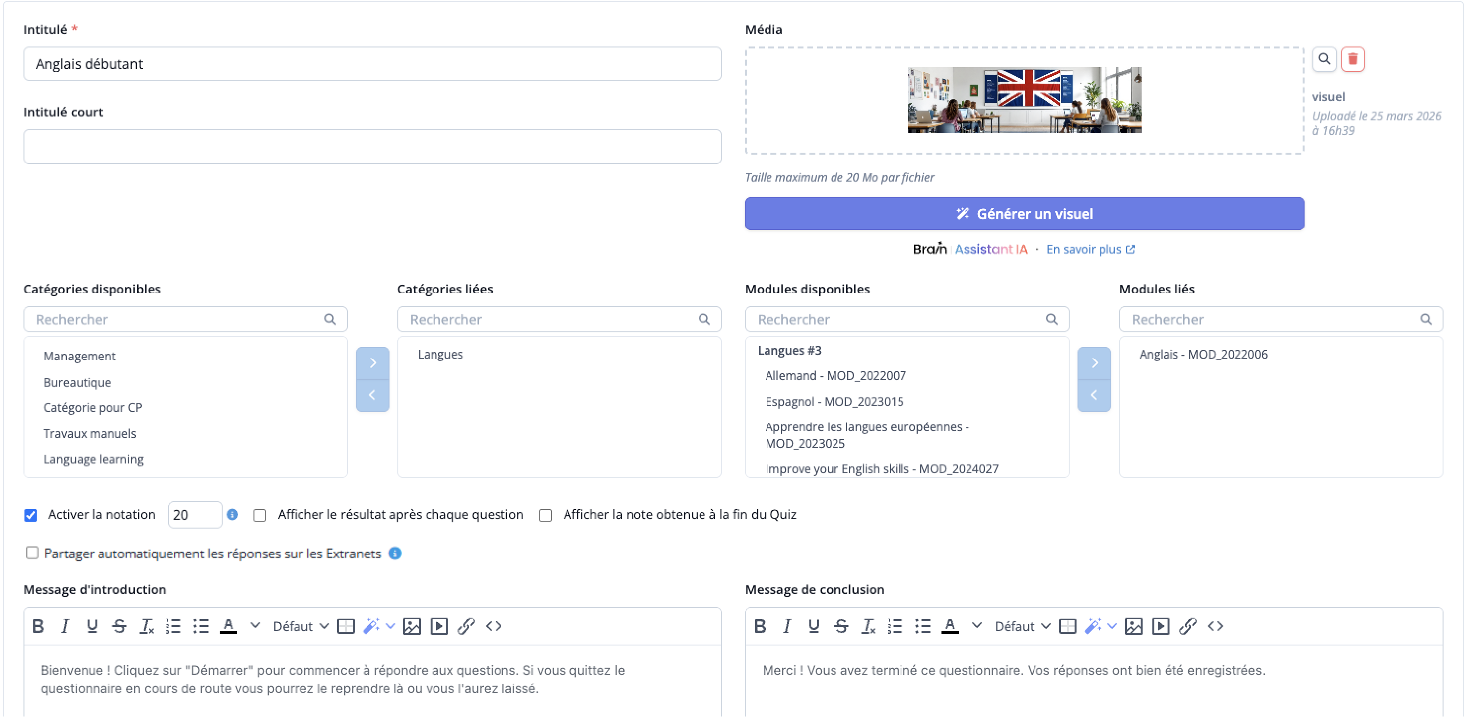 - Un Visuel pour illustrer votre Questionnaire : glissez-déposez un fichier pour l’uploader, ou bien cliquez sur l'encadré pour sélectionner ensuite le visuel souhaité sur votre ordinateur et ainsi l'ajouter au champ. Vous pouvez également cliquer sur Générer un visuel pour que l’assistant IA crée une bannière d’illustration du Quiz au bon format, en se basant sur l’intitulé du Modèle de Quiz et des Catégories ou Modules que vous avez éventuellement liés (il ne se base pas sur leur contenu !).