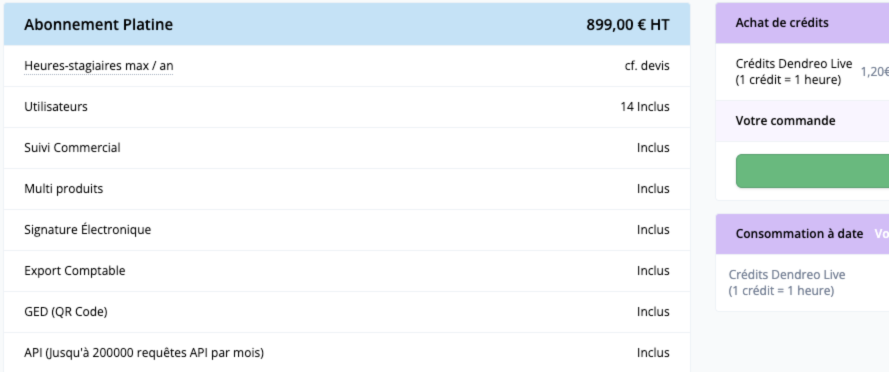 Votre consommation de crédits pour les Signatures numériques, les Émargements électroniques et Dendreo Live est indiquée sur la droite de votre page Abonnement :