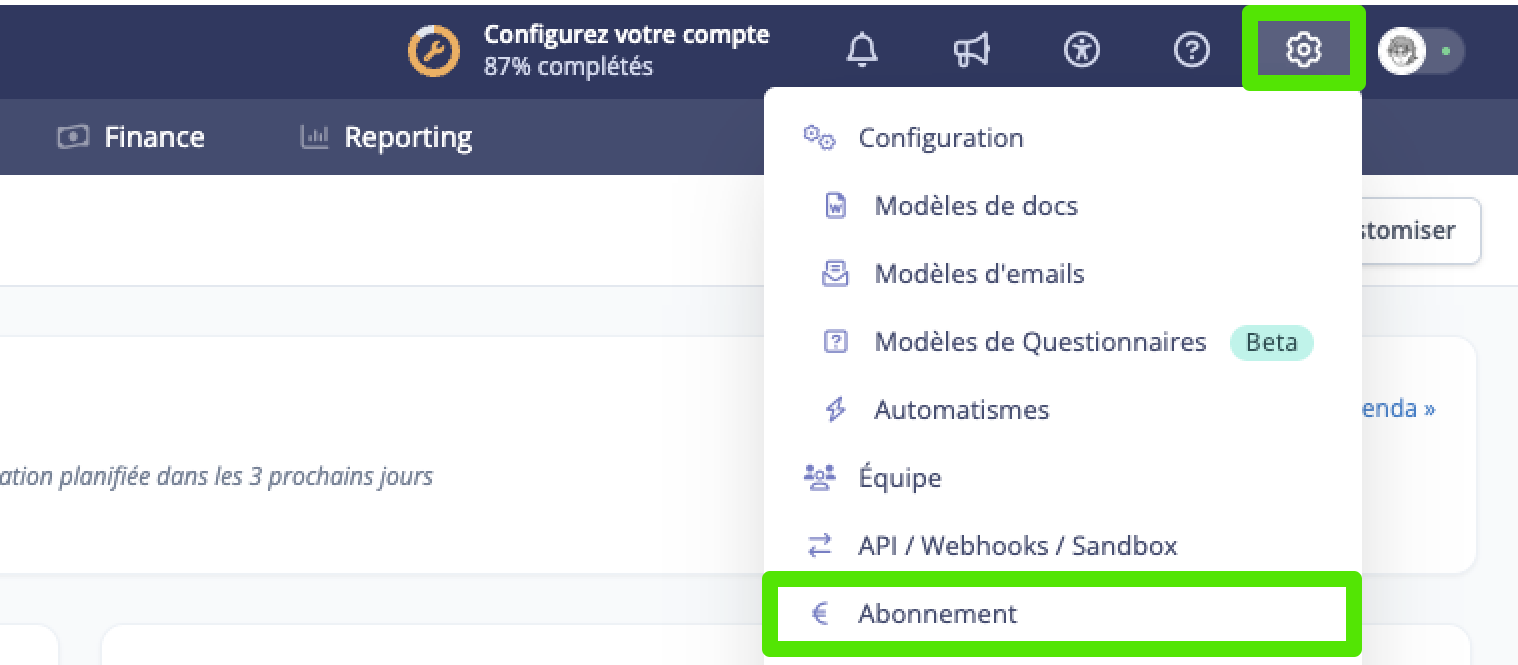 Pour accéder aux informations de votre abonnement Dendreo, cliquez sur l'icône de configuration > Abonnement.