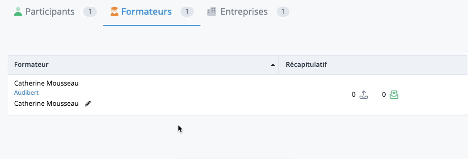 Depuis l’onglet Formateurs, vous pouvez sélectionner le destinataire pour chaque Formateur, pour que l’Email au départ à destination du Formateur soit finalement envoyé à son directeur par exemple. Pour cela, cliquez sur l’icône de crayon ci-dessous puis sélectionnez le destinataire dans la liste déroulante.