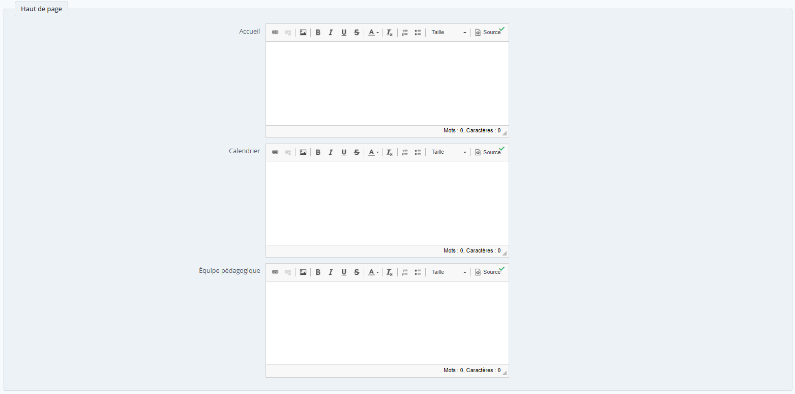 Dans cette section, définissez un contenu personnalisé pour les pages Accueil, Catalogue et Équipe pédago :