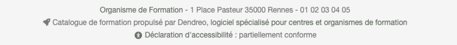 - Pied de page : saisissez le contenu que vous souhaitez afficher dans le pied de page de votre Catalogue Public. Par défaut, si vous n'indiquez rien dans ce champ, c'est le nom de votre Organisme de Formation ainsi que son adresse postale et numéro de téléphone qui s'affichent. Vous y retrouvez également la Déclaration d'accessibilité de votre Catalogue Public.