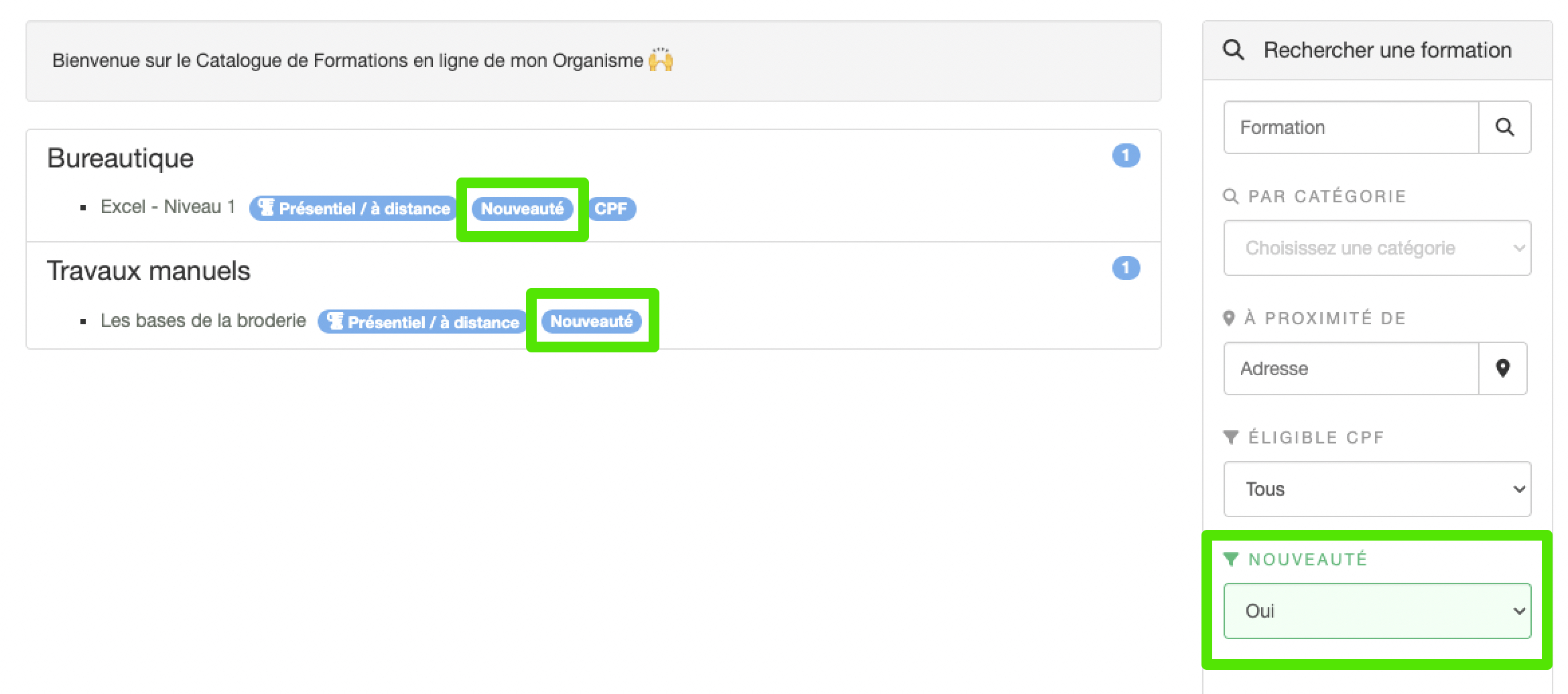 - Nouveauté : en cochant cette mention, un badge Nouveauté s’affiche à côté du nom de votre nouveau Module. Il n’y pas de limite dans le temps et nous vous invitons à décocher cette mention lorsque vous estimez que la Formation n'est plus une nouveauté. Vous pouvez également filtrer les éléments du Catalogue Public par nouveauté depuis la colonne de droite :