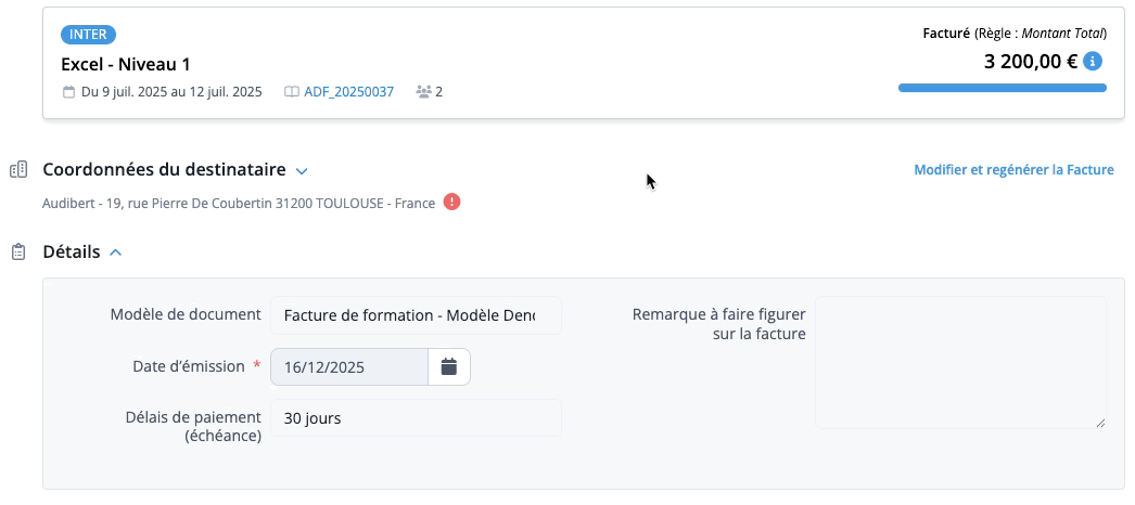 Indiquez ensuite les coordonnées du destinataire de la Facture. Elles sont préremplies avec les informations trouvées sur la fiche Entreprise ou la base de données pour les OPCO et Financeurs publics.