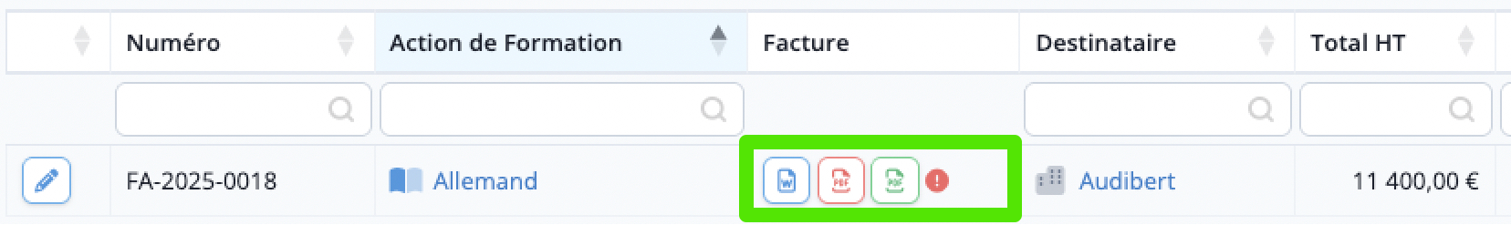 Depuis l'onglet Factures, gérez toutes les Factures pour votre Action de Formation. Vous pouvez notamment :