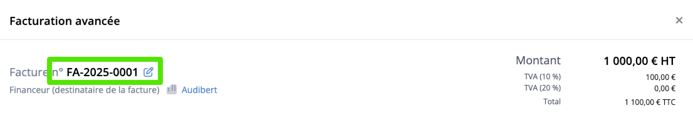 Depuis l'interface de Facturation avancée, survolez la section souhaitée puis cliquez sur Modifier et regénérer la Facture. Modifiez ensuite le champ souhaité puis cliquez sur Sauvegarder : la version précédente de la Facture sera écrasée et remplacée par celle-ci, qui sera alors figée et ne pourra pas être modifiée.