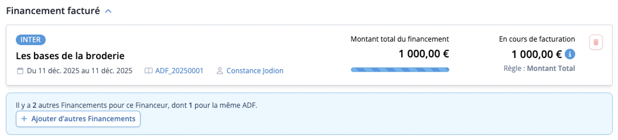 À noter : vous pouvez facturer plusieurs Financements au sein de la même Facture (même si les Financements n'appartiennent pas à la même ADF), à condition que le Financeur soit le même !