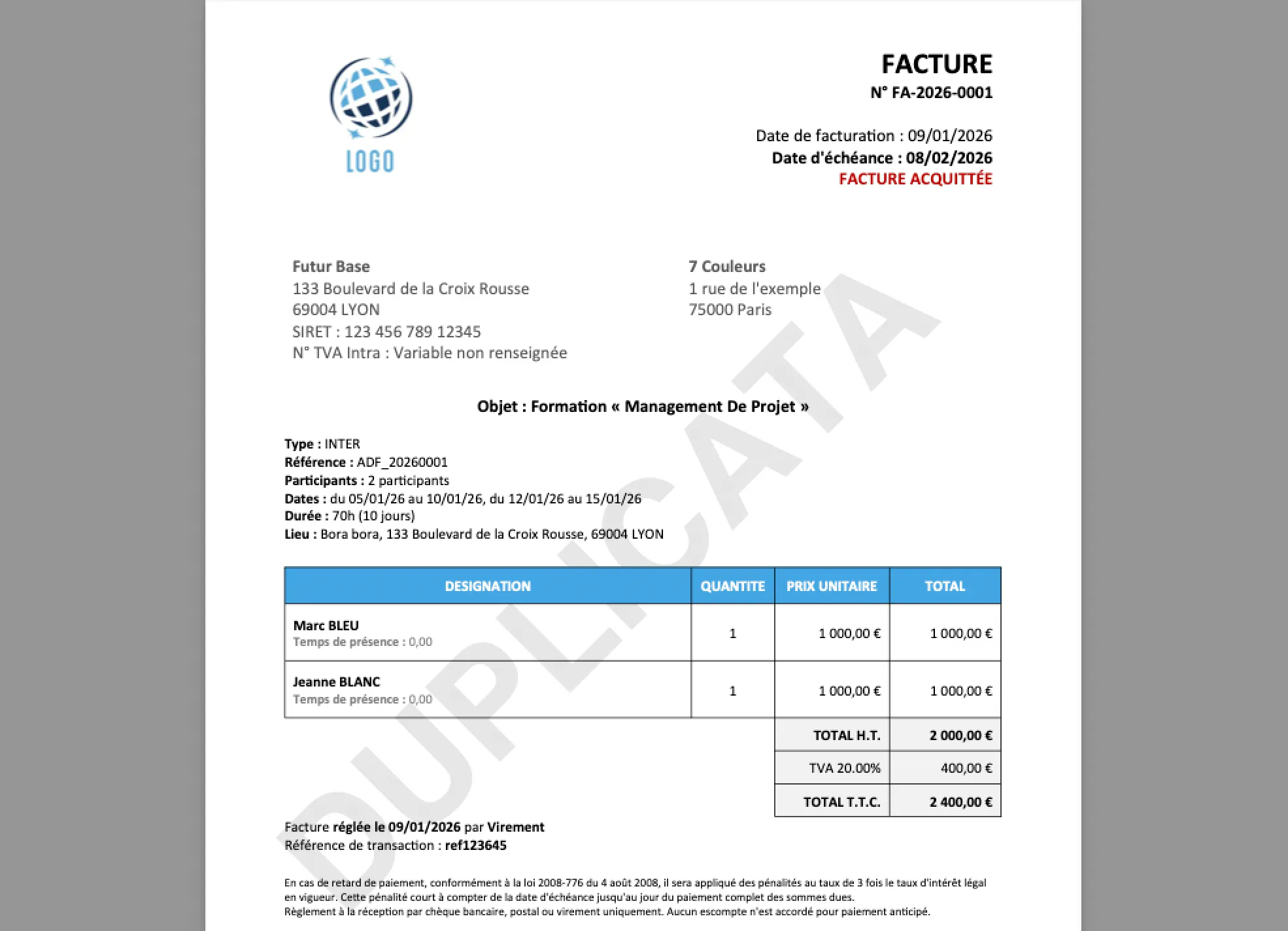 À partir du 31 janvier 2026, une Facture ne sera plus mise à jour et restera inchangée, quels que soient les Règlements reçus après son émission. Pour transmettre une Facture à jour contenant tous les Règlements, vous devez donc utiliser l’option de Duplicata.