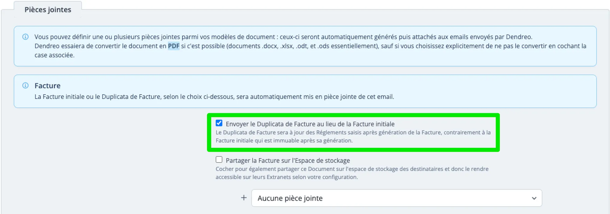 Depuis l’édition ou la création d’un Modèle d’Email lié aux Factures, vous pouvez également sélectionner l’option Envoyer le Duplicata de Facture au lieu de la Facture initiale pour choisir le Document à utiliser en PJ.