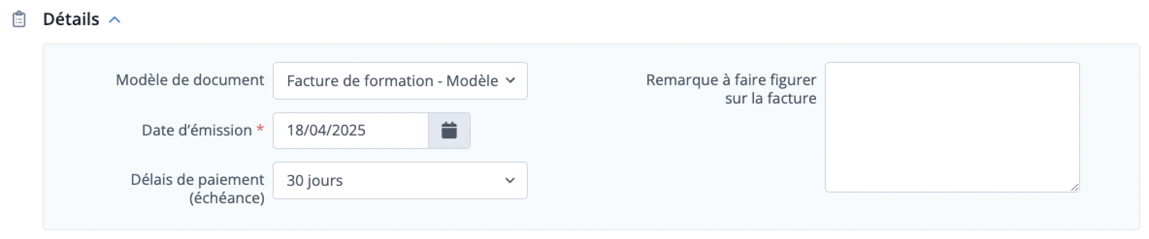 À noter : au moment de la génération de la Facture, le Modèle de document indiqué dans la section Détails est également figé. Ainsi, si vous modifiez la version du Modèle depuis la configuration et souhaitez utiliser cette nouvelle version pour la Facture, vous devez modifier et régénérer la Facture.