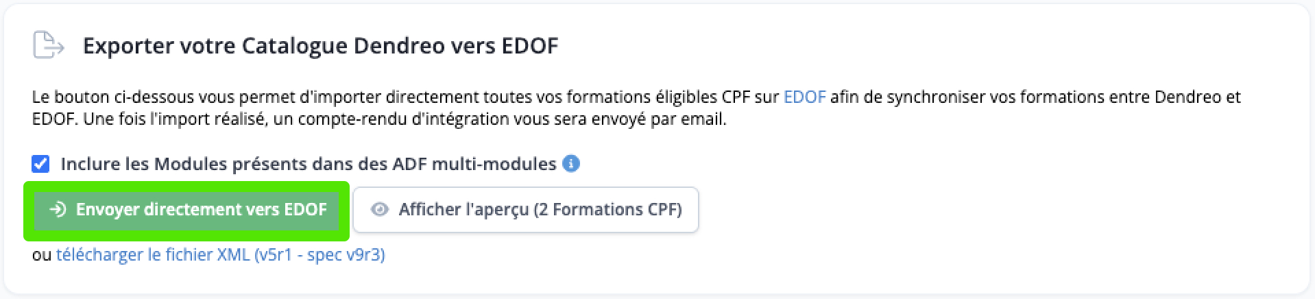 Si vous avez activé notre option de synchronisation EDOF, vous retrouvez le bouton Envoyer directement vers EDOF : celui-ci vous permet d'importer en un clic toutes vos Formations éligibles au CPF sur EDOF.