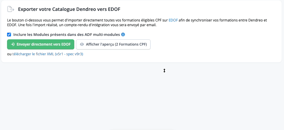 - EDOF fonctionne par numéro SIRET, donc si vous êtes en multi-centres sur Dendreo, faites attention à exporter votre Catalogue de Formations CPF correspondant au compte EDOF dans lequel vous allez importer le fichier XML !