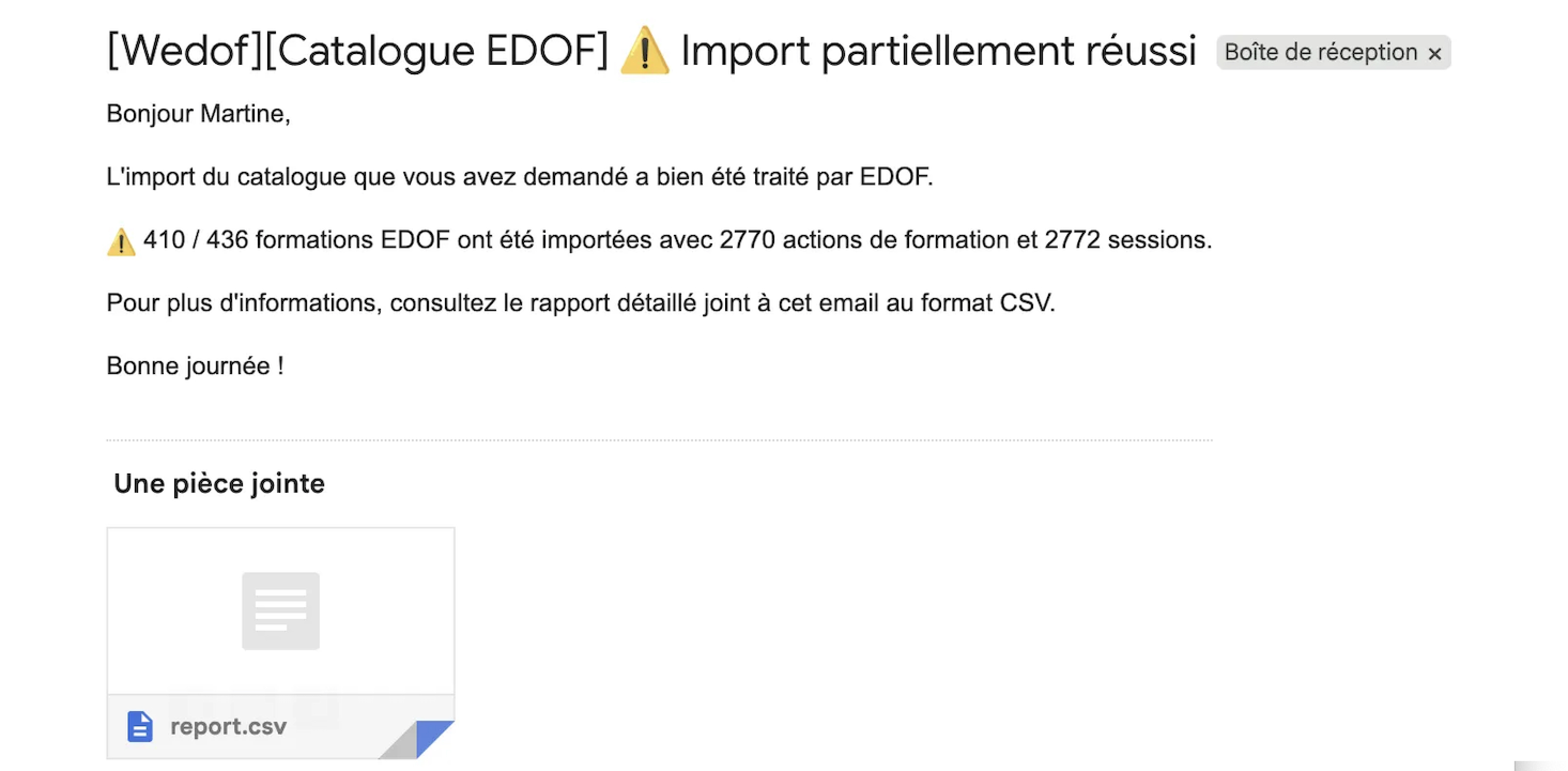 Une fois l'envoi vers EDOF effectué, vous recevrez alors un email récapitulatif contenant le compte-rendu d'intégration. En cas d’erreurs détectées, il est de votre responsabilité de les vérifier et corriger.