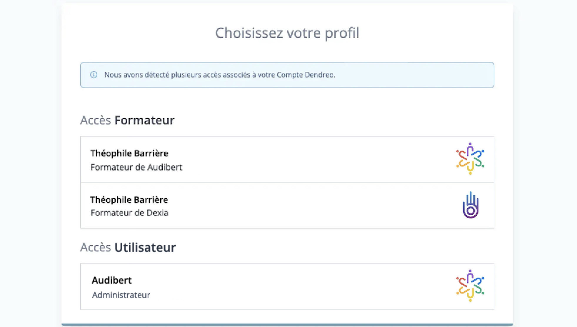 Cas d'usage : j'ai un profil administrateur et un profil Formateur sur Dendreo, et je souhaite pouvoir basculer de l'un à l'autre sans me déconnecter et me reconnecter.