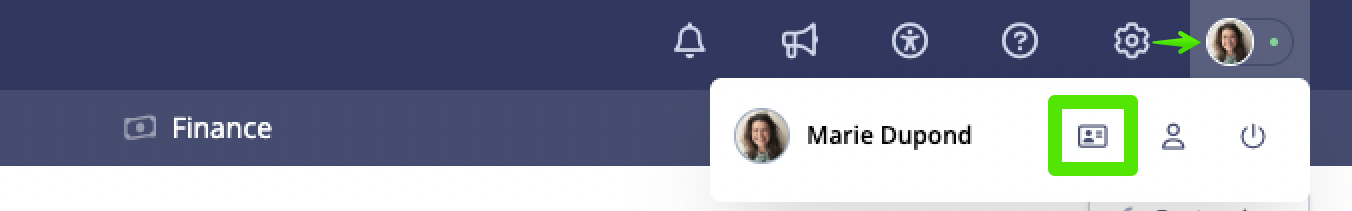 Pour accéder à vos informations de connexion à Dendreo, cliquez sur votre photo de profil ou sur vos initiales en haut à droite de votre fenêtre, puis sur l'icône de carte d'identité.