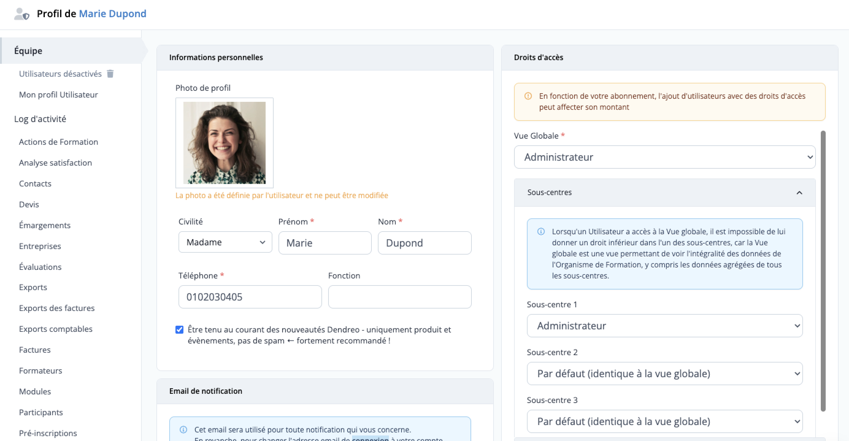 Chaque utilisateur ayant des droits d'accès à un compte Dendreo peut gérer en autonomie et à tout moment ses identifiants de connexion à Dendreo, ses informations personnelles et ses accès Dendreo.