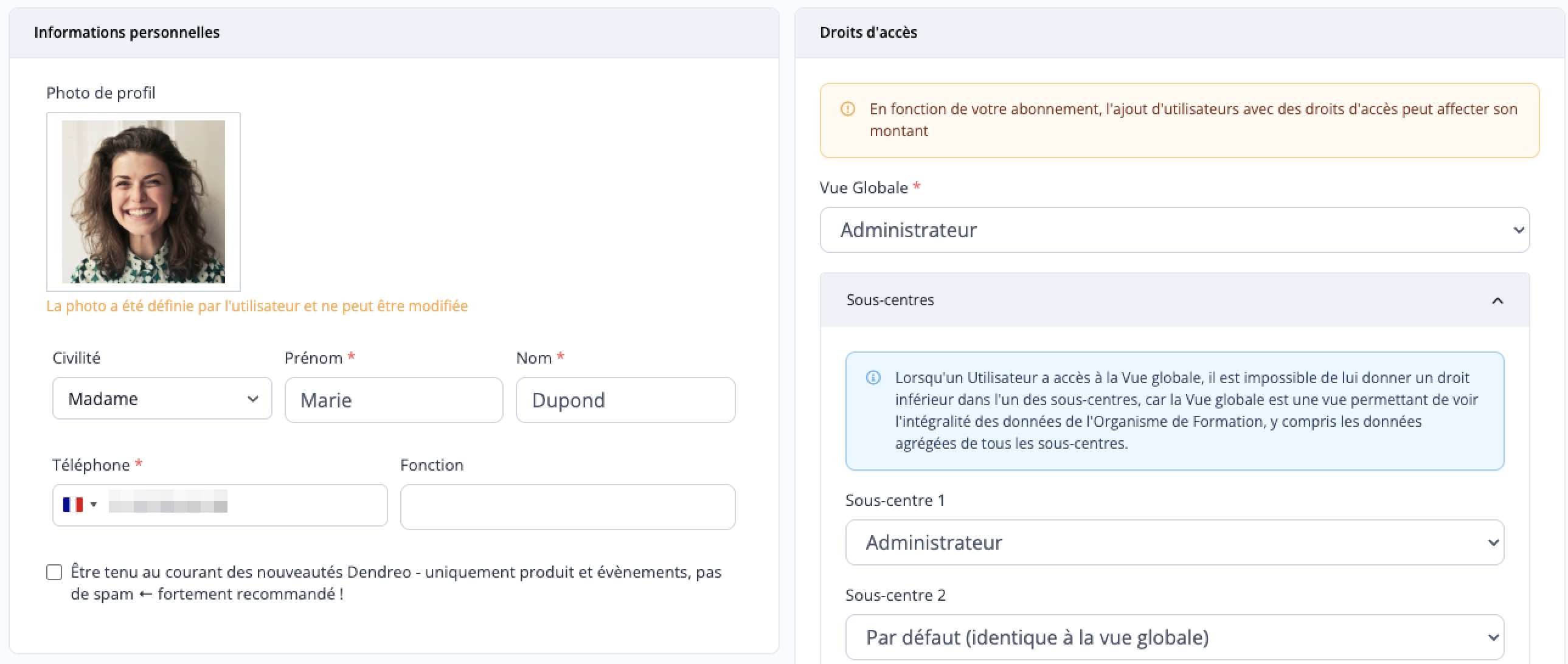 - Numéro de téléphone : le numéro de la ligne directe qui permettra aux équipes de Dendreo de vous joindre en cas de support technique. Vous pouvez ajouter des numéros de téléphone avec ou sans espace, avec +33 sans limitation de chiffre ;