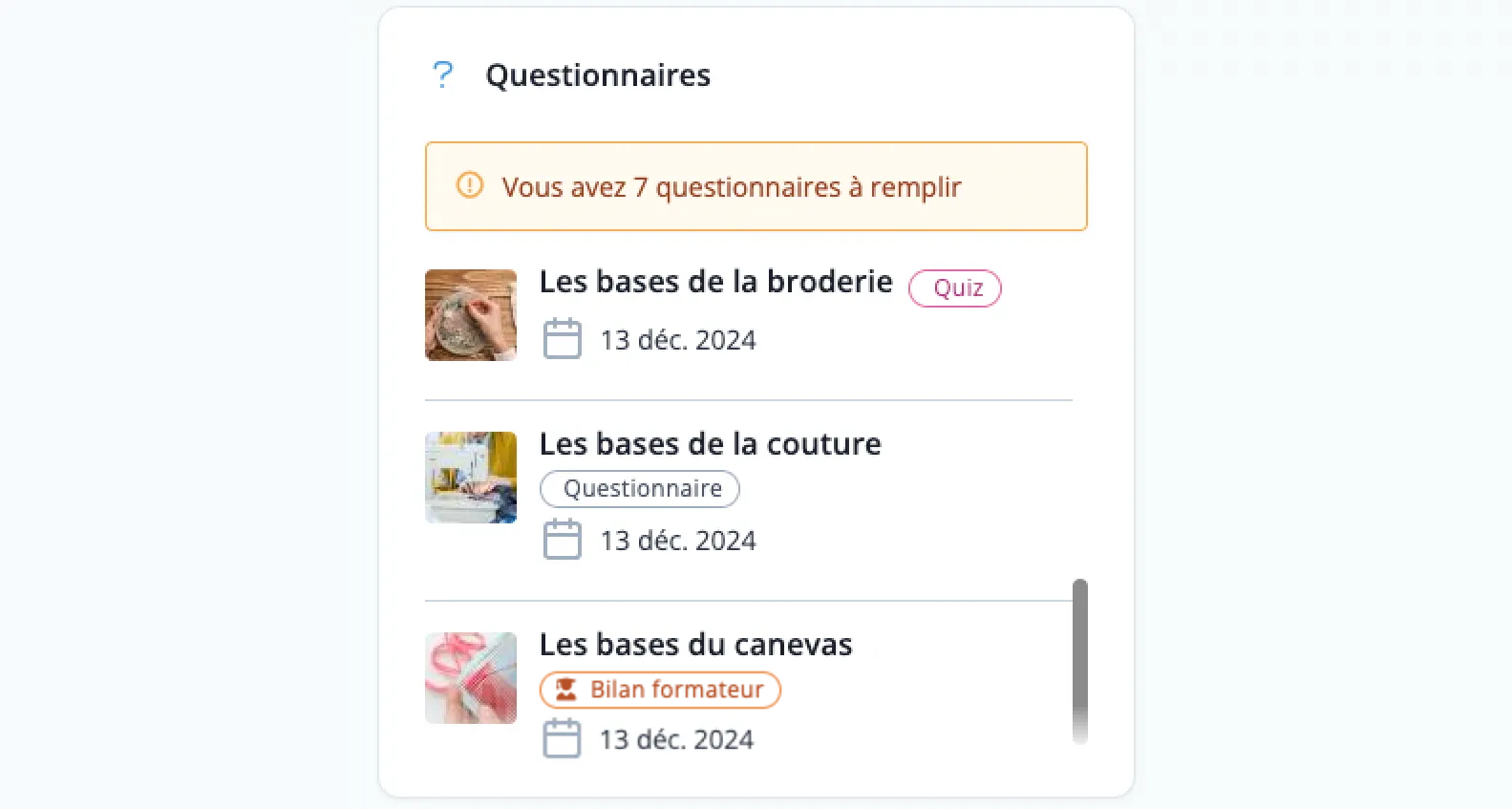 Pour plus d'informations sur le suivi des résultats à un Questionnaire, consultez notre documentation Suivre les résultats des Questionnaires à destination de l'Organisme de Formation.