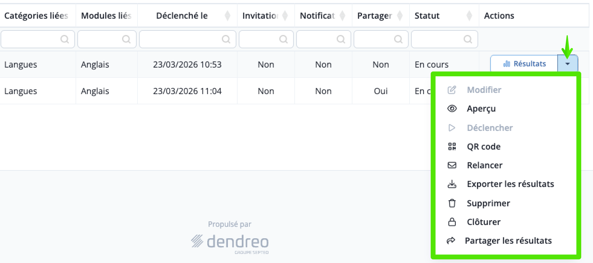 Depuis la colonne Actions, vous pouvez également exporter les résultats d'un Questionnaire.