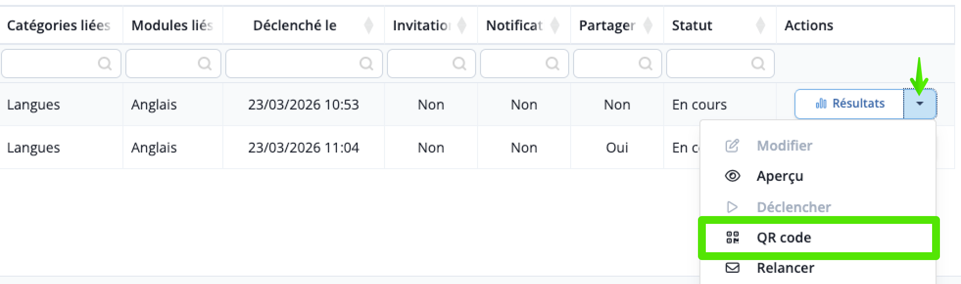 Pour cela, depuis la colonne Actions, cliquez sur QR Code.