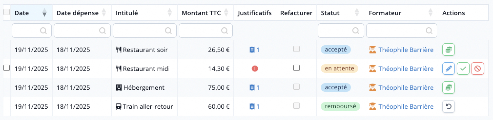- Depuis la fiche d'un Formateur, gérez l'ensemble des Notes de frais liées au Formateur (toutes Actions de Formation qu'il a dispensées confondues) ;