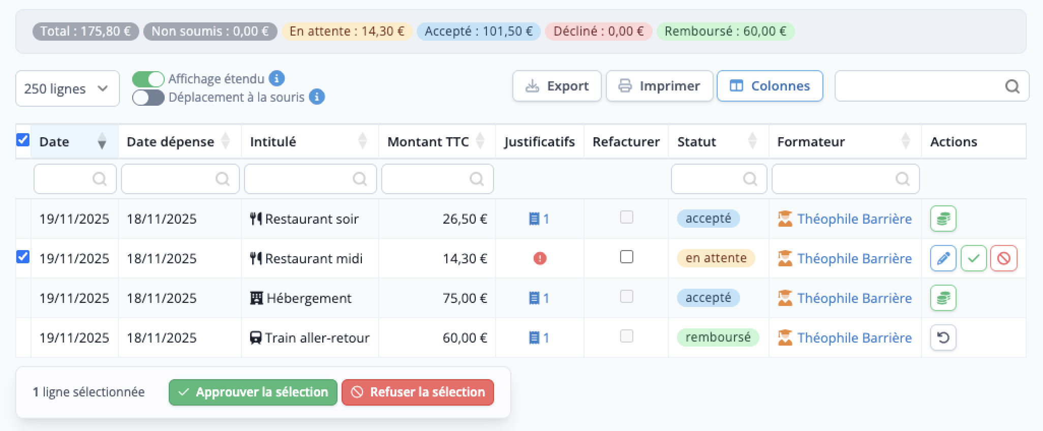 Une fois une Note de frais soumise par le Formateur, vous pouvez la traiter et ainsi :