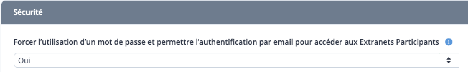 Depuis la section Sécurité, configurez le champ Forcer l'utilisation d'un mot de passe et permettre l'authentification par Email pour accéder aux Extranets Participants : cette option est désactivée par défaut.