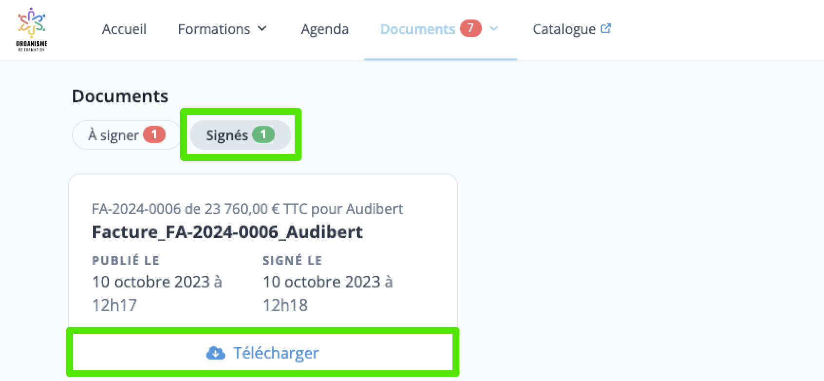- Une indication concernant la non-altération du document depuis sa signature sur Dendreo.