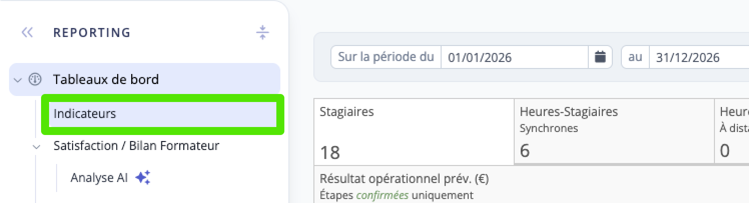 Vous retrouvez les indicateurs de votre compte depuis le menu Reporting > Tableau de bord > Indicateurs.