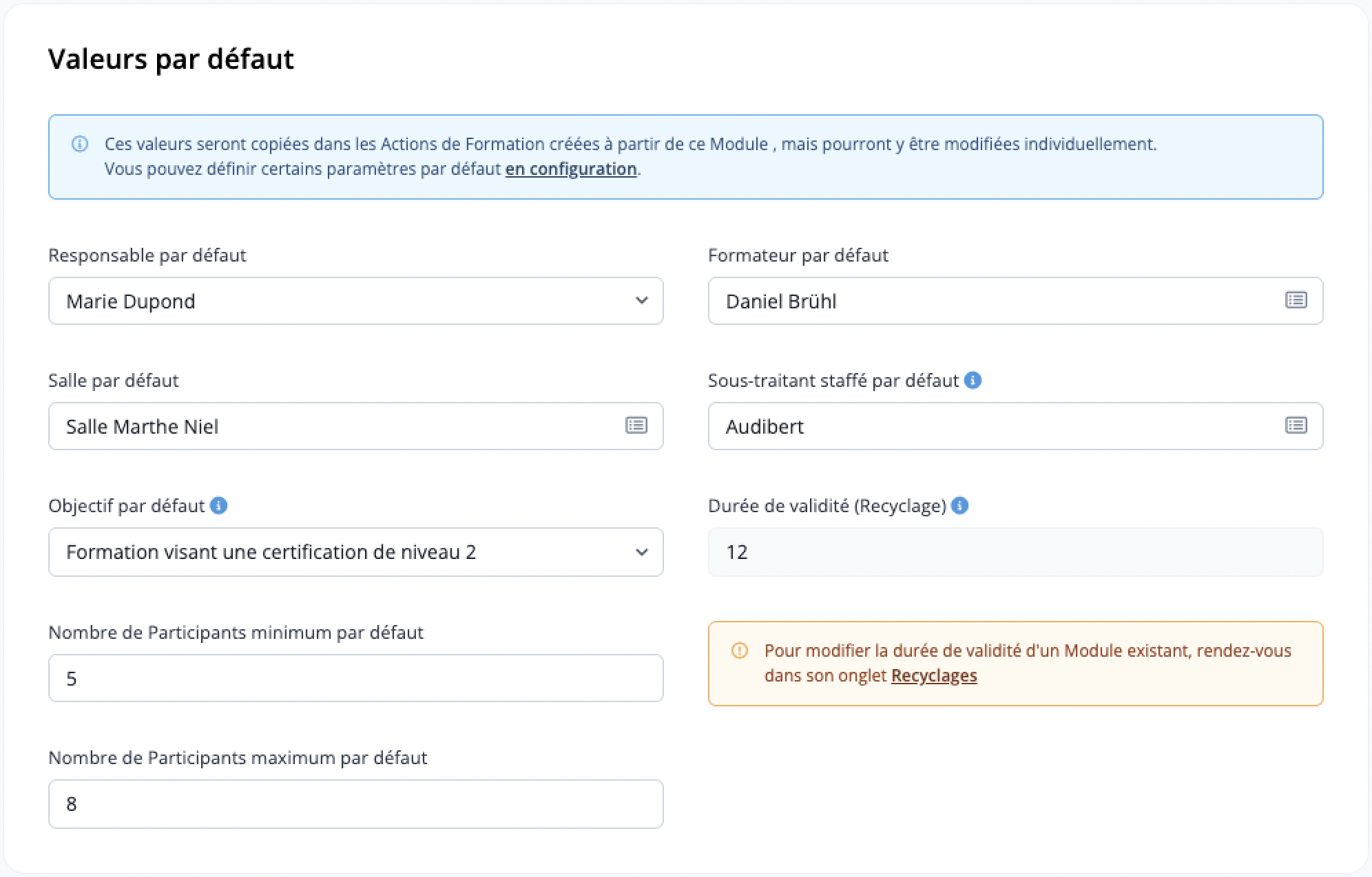 Comme pour l'ensemble des fonctionnalités de Dendreo, vous pouvez configurer certaines données par défaut depuis l'interface de configuration. Une fois ces valeurs par défaut définies (public visé, modalités pédagogiques, nombre de Participants minimum et maximum, etc.), la configuration s'applique et les champs concernés se renseignent automatiquement sur la fiche de chaque nouveau Module créé.