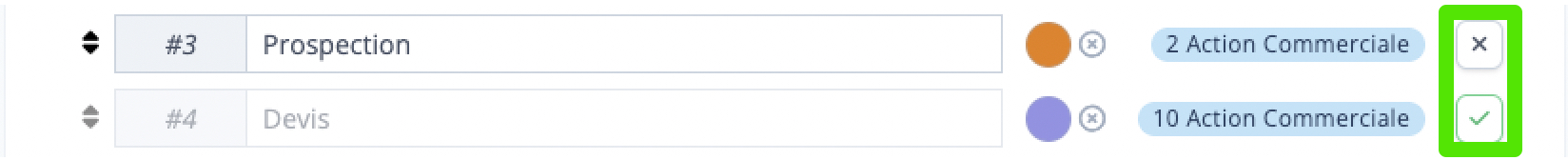 Cliquez sur la coche en bout de ligne pour afficher (coche verte) ou masquer (coche grise) une catégorie d'Action commerciale dans les menus déroulants du Suivi commercial.