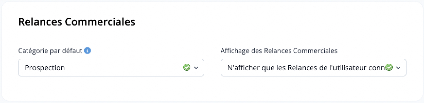 - La catégorie par défaut de la Relance lorsque vous en créez une : si vous choisissez Aucune, la Relance héritera de la catégorie définie sur l'Action commerciale précédente ;