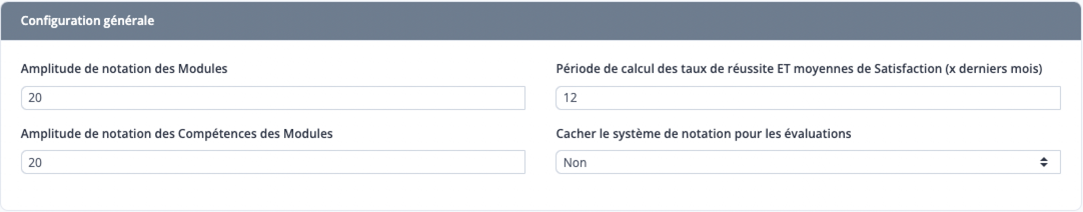 - La période de calcul des taux de réussite et des moyennes de Satisfaction affichés sur votre Catalogue Public (calculés en mois) ;