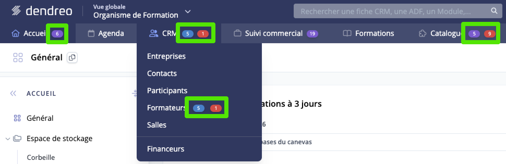Depuis votre compte Dendreo, vous retrouvez vos notifications à deux endroits : soit depuis l'icône de cloche présente dans le bandeau en haut de page, soit sous la forme d'une bulle sur chaque menu concerné.