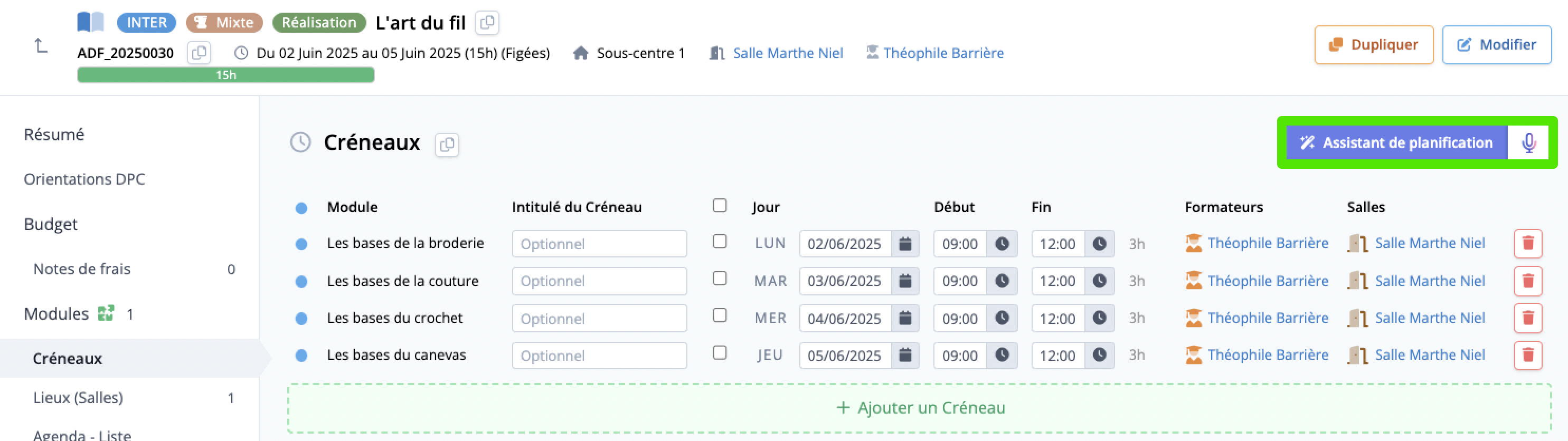 Une fois l'option activée sur votre compte, vous pouvez utiliser notre assistant de planification depuis les onglets Modules, Créneaux, Salles, Agenda ou Formateurs de votre Action de Formation.