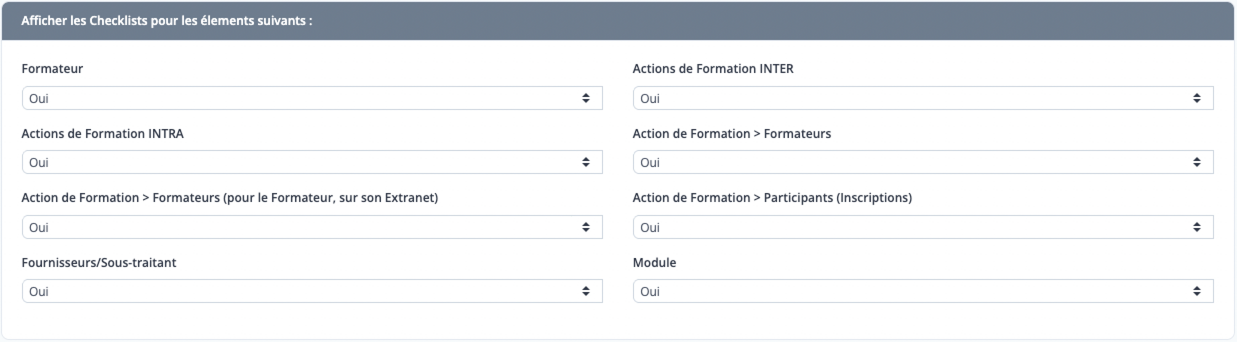 Commencez par choisir si vous souhaitez voir apparaître les checklists sur votre configuration du logiciel en sélectionnant Oui ou Non pour chacun des éléments suivants :