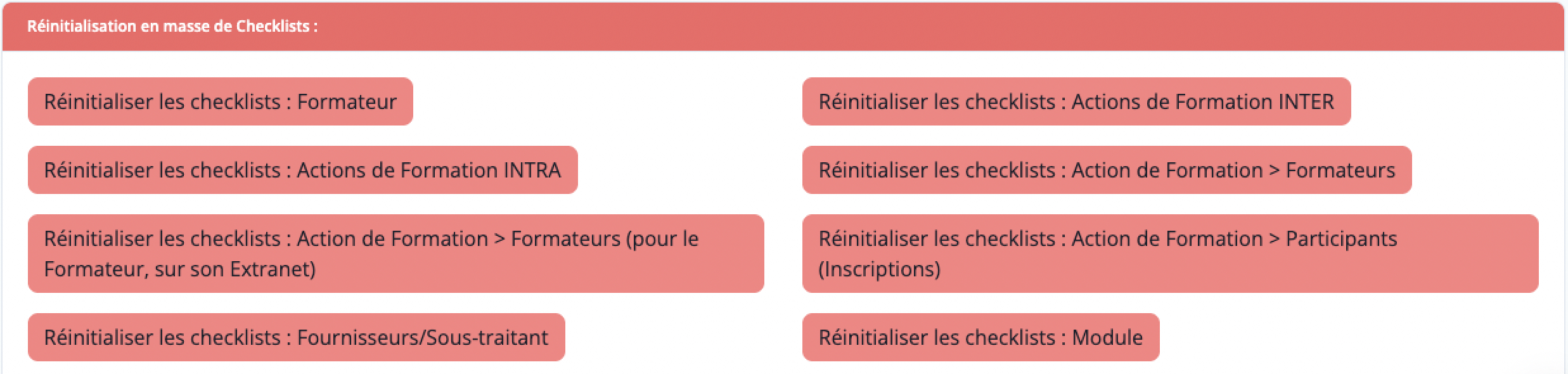 Vous avez la possibilité de réinitialiser d'anciennes checklists avec celles ajoutées dans la configuration.