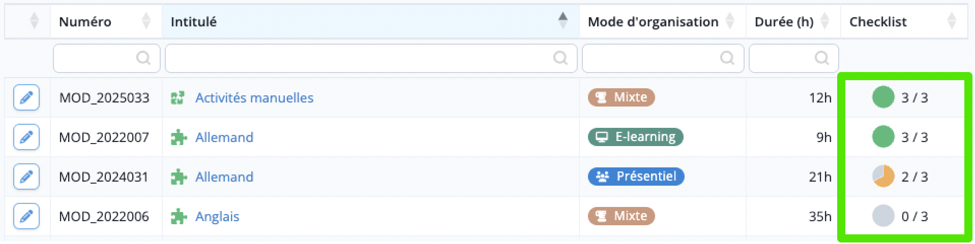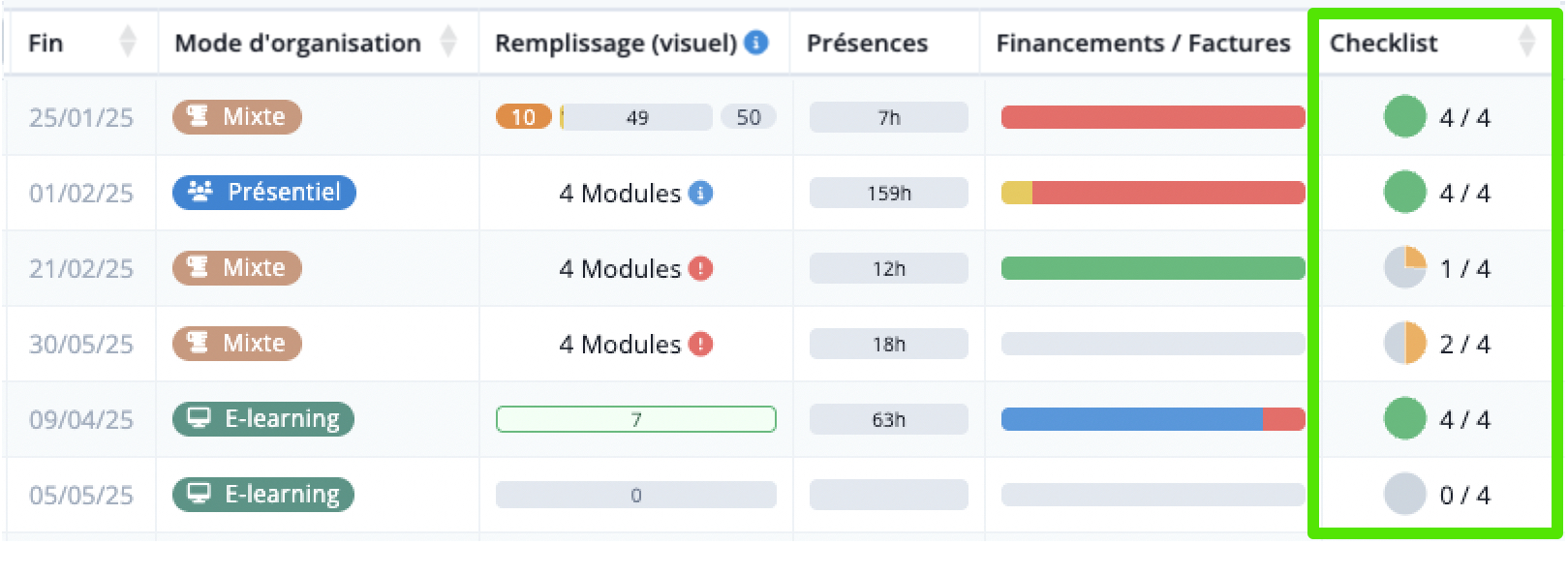 Bien que vous puissiez définir des étapes différentes pour les checklists des Actions de Formation de type INTRA ou INTER, vous pourrez les retrouver dans les mêmes stades : ces checklists apparaissent au niveau du tableau récapitulatif de toutes vos Actions de Formation INTER et INTRA.