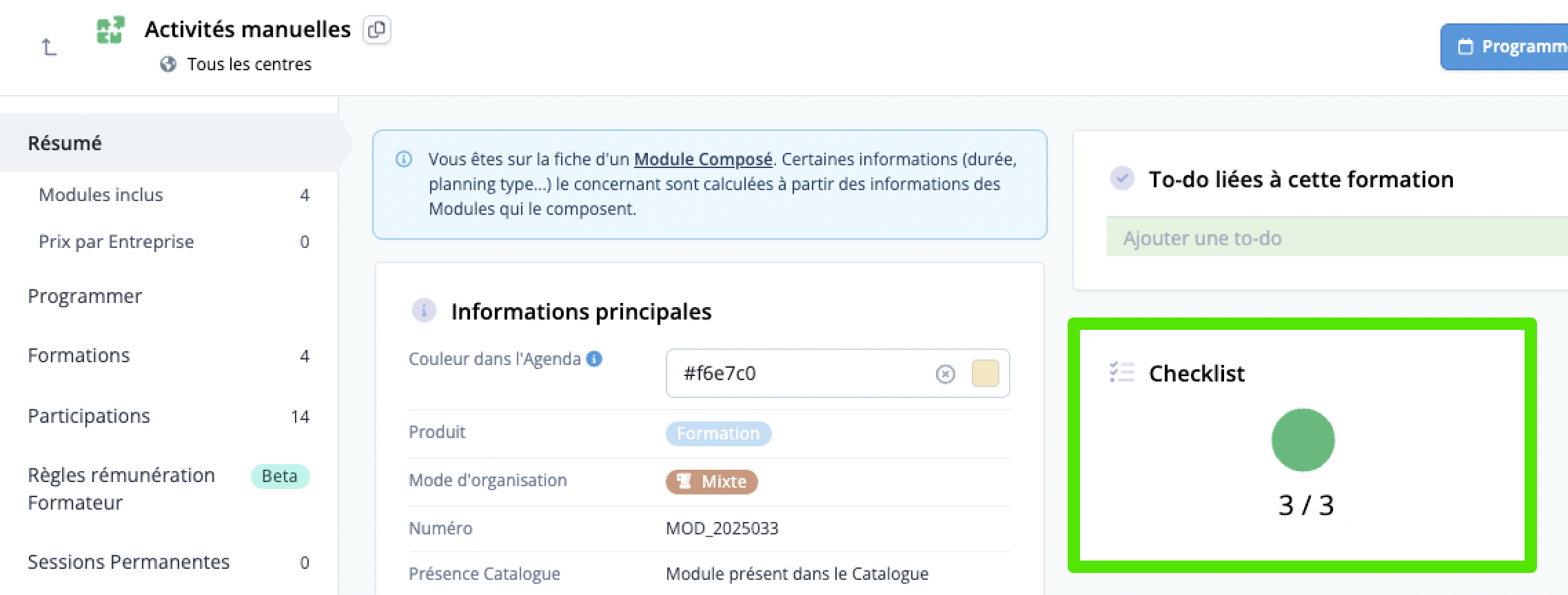 La checklist Module correspond aux étapes que vous souhaitez suivre pour la mise en place de l'ensemble des Modules de votre Catalogue de Formation.
