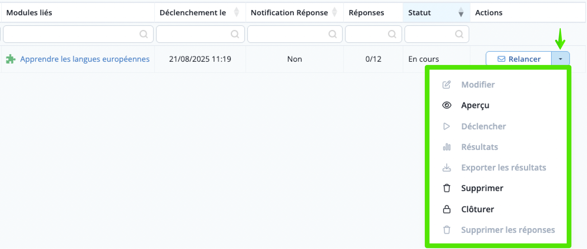 - Supprimer l'ensemble des réponses collectées pour ce Questionnaire. Vous pouvez supprimer une réponse en particulier (ou même toutes les réponses d'un destinataire spécifique) depuis l'interface Résultats.