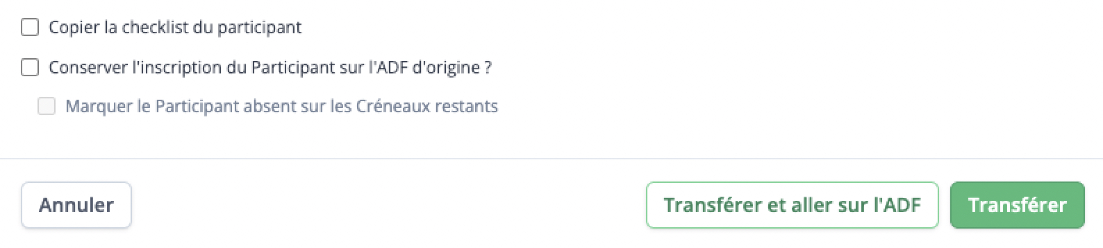 Vous pouvez également conserver l’inscription du Participant sur l’ADF d’origine. Dans certains cas, l'option est grisée et ne peut pas être décochée : le Participant ne peut alors pas être supprimé de l'ADF.