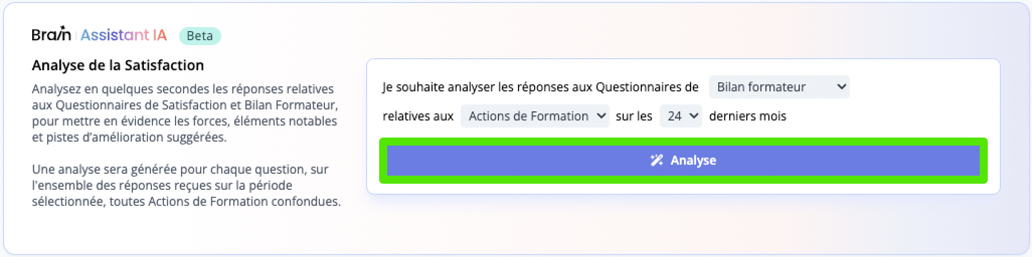 Depuis le menu Accueil > Satisfaction / Bilan Formateur > Analyse IA, sélectionnez les éléments suivants :
