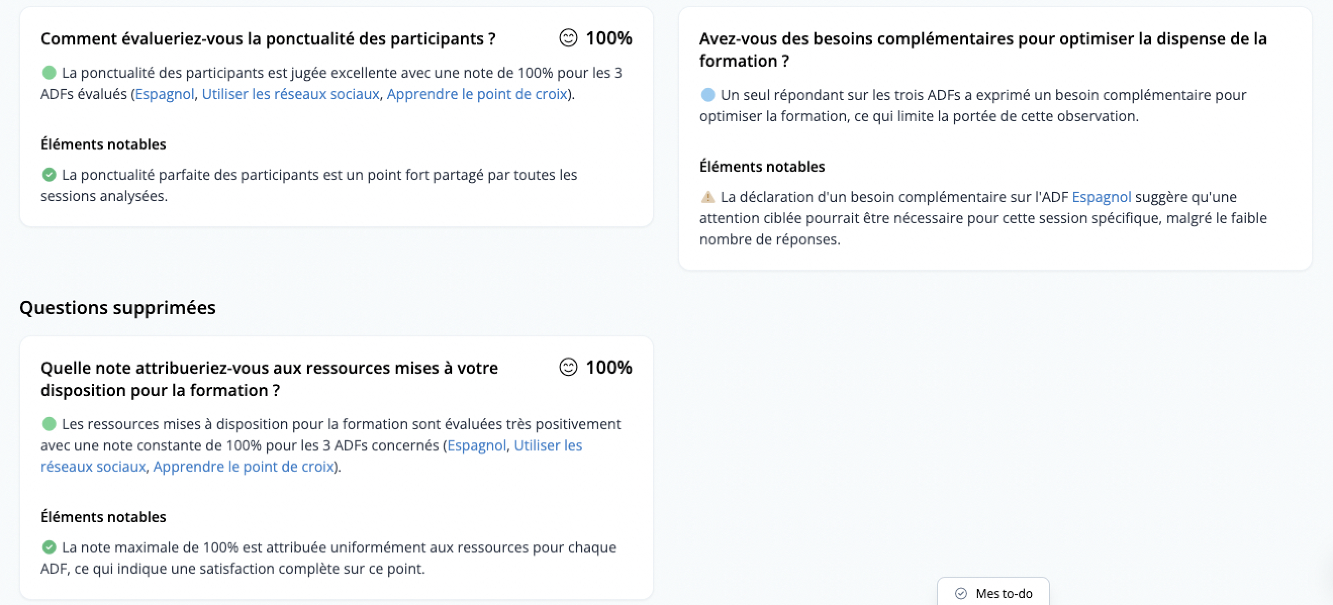 À noter : si une question ayant obtenu des réponses a été supprimée avant l'analyse, l'assistant IA la prend tout de même en compte et génère l'analyse dans une rubrique dédiée Questions supprimées.