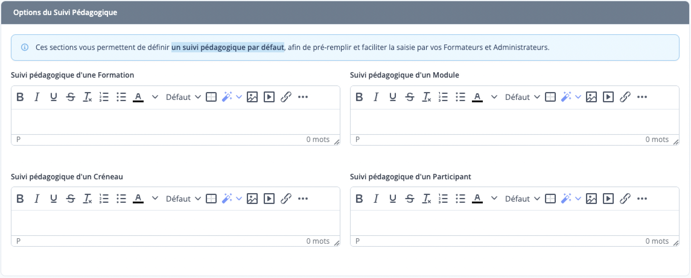 Pour cela, rendez-vous sur l'interface de configuration du Suivi pédagogique. Vous pouvez définir un contenu par défaut pour le Suivi pédagogique d'une Formation, d'un Module, d'un Créneau ou encore d'un Participant.