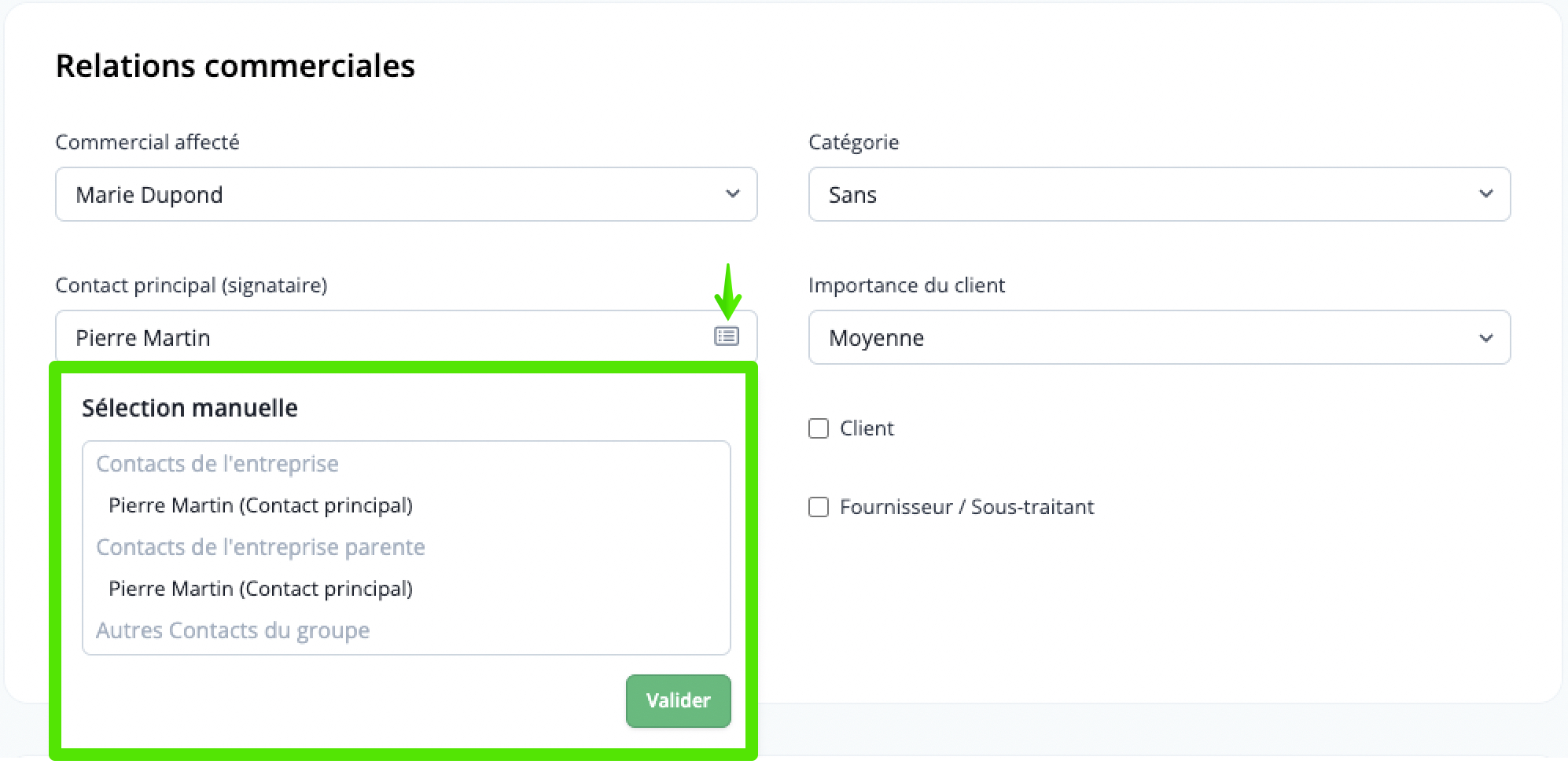 Pour associer le Contact d'une Entreprise à une autre Entreprise du Groupe, rendez-vous sur l’interface de modification de l’Entreprise. Dans les champs de sélection des Contacts principaux, secondaires ou facturation, vous pouvez sélectionner un Contact faisant partie de l’Entreprise parente ou du même Groupe :