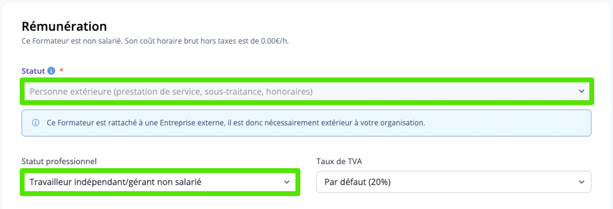 En rattachant ce Formateur à une Entreprise, il est nécessairement indiqué comme étant une Personne extérieure. Sélectionnez ensuite le statut professionnel Travailleur indépendant/gérant non salarié.