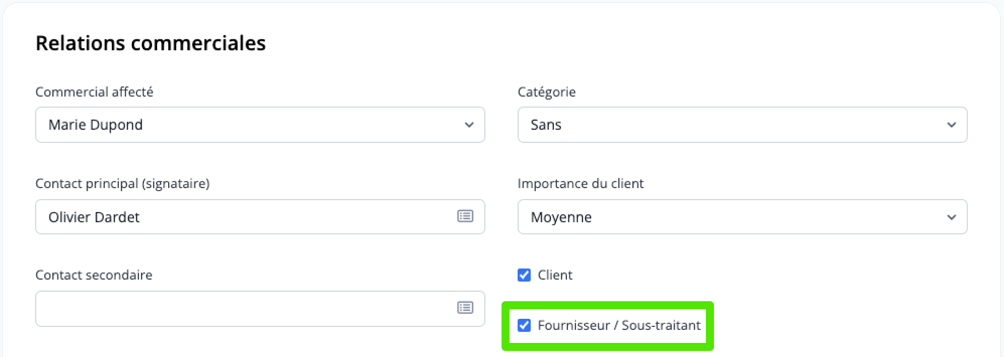 Une fois une Entreprise renseignée sur la fiche Formateur, la case Fournisseur / Sous-traitant se coche automatiquement sur la fiche Entreprise.