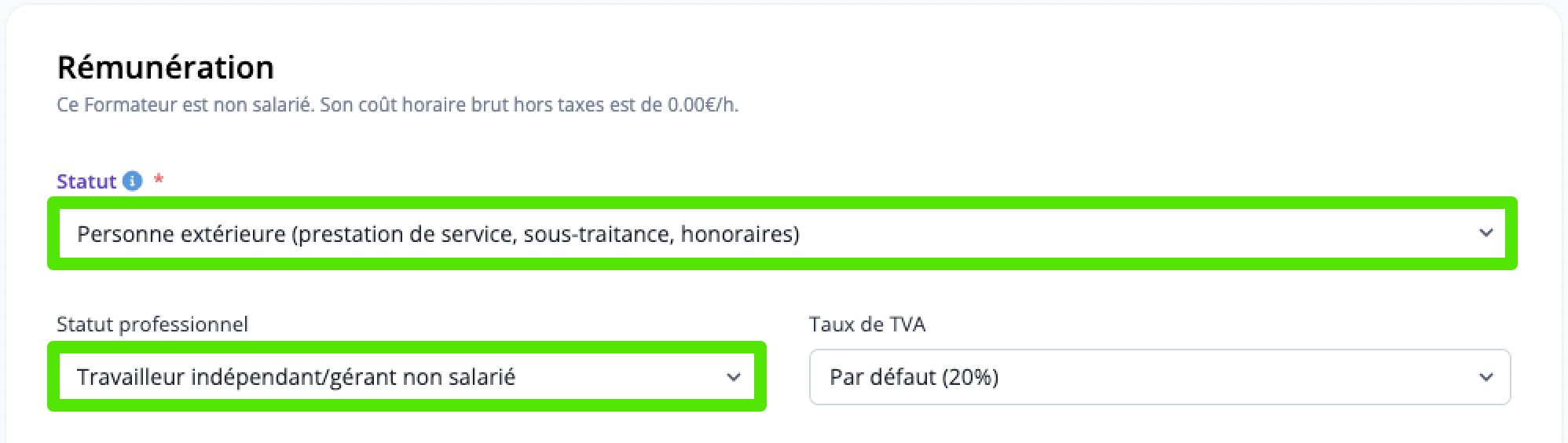 Dans l’encadré Statut et Rémunération, sélectionnez le statut Personne extérieure et le statut professionnel Travailleur indépendant/gérant non salarié.