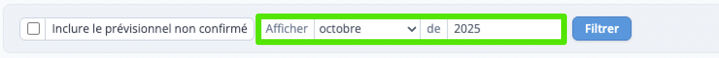 Pour commencer le pilotage de vos FAE et PCA, vous devez choisir la période souhaitée : cela peut être pour un mois spécifique ou pour une année complète. Cliquez sur Filtrer pour sélectionner la période. C'est sur cette période que se base ensuite Dendreo pour calculer les montants et les heures affichés dans le tableau.