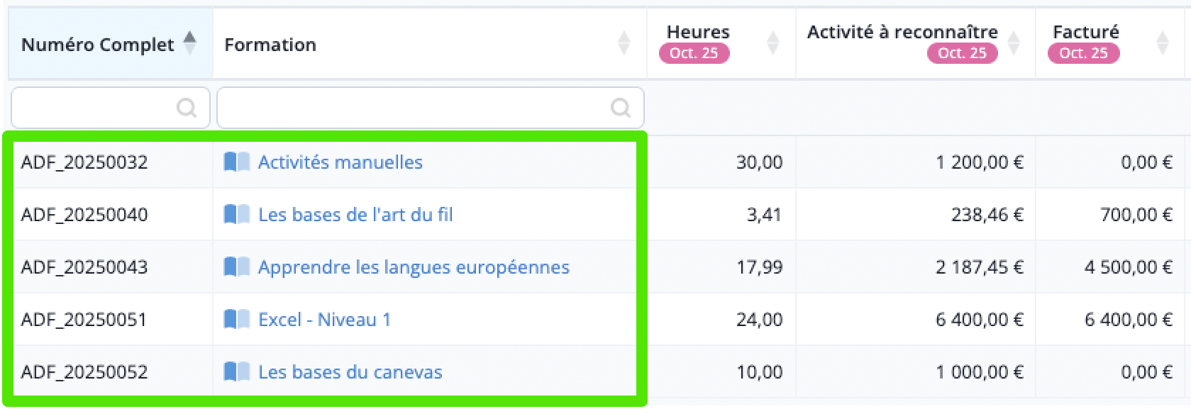 - Au moins une Facture a été émise pour l'Action de Formation sur la période sélectionnée OU l'Action de Formation a des FAE ou PCA d'un montant supérieur à 0.